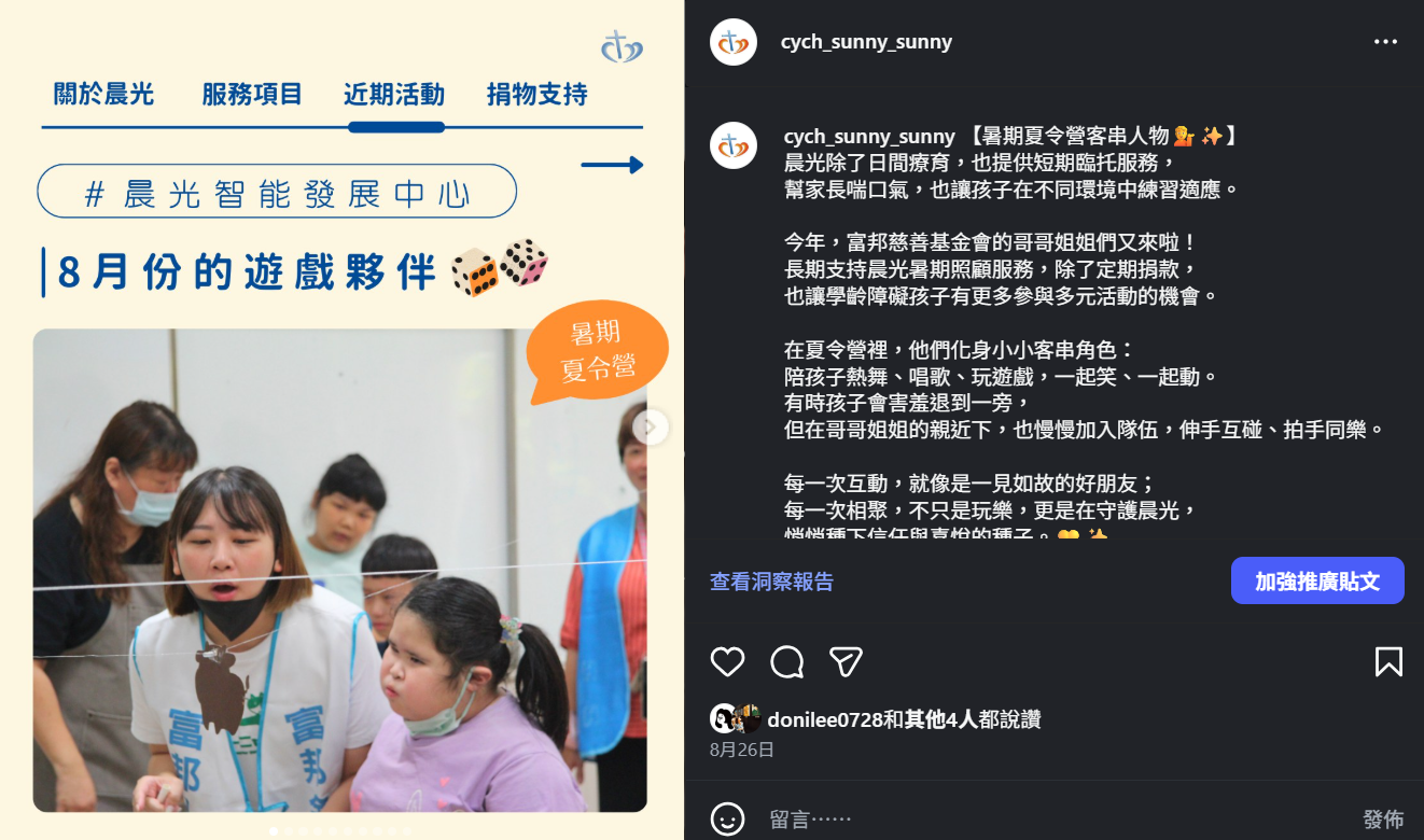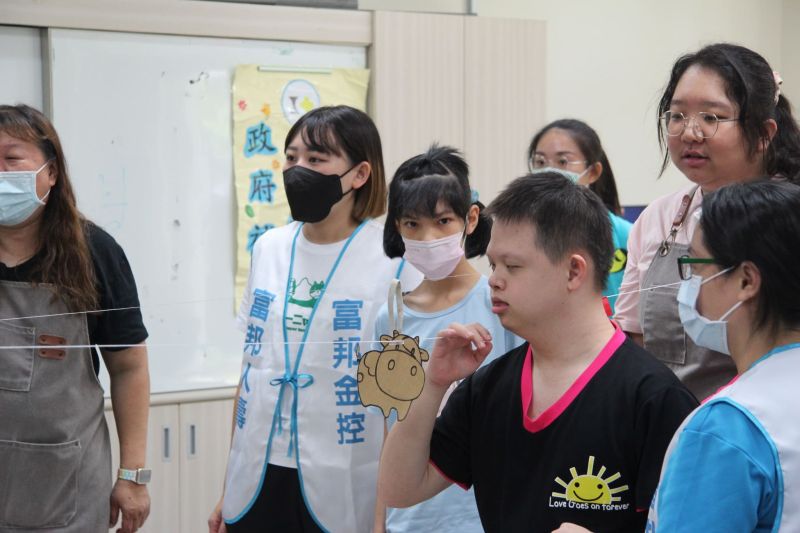 晨光智能發展中心暑期生活營:本期活動課程中讓學童們參與才藝學習、作業輔導、體適能活動與趣味競賽⋯⋯等,富邦志工們也陪同學童一起歡樂互動,讓志工們學習如何陪伴身障學童?感受身障學童們在學習時會遇到的困難?可以更多地思考身障遲緩學童需要的資源與協助?