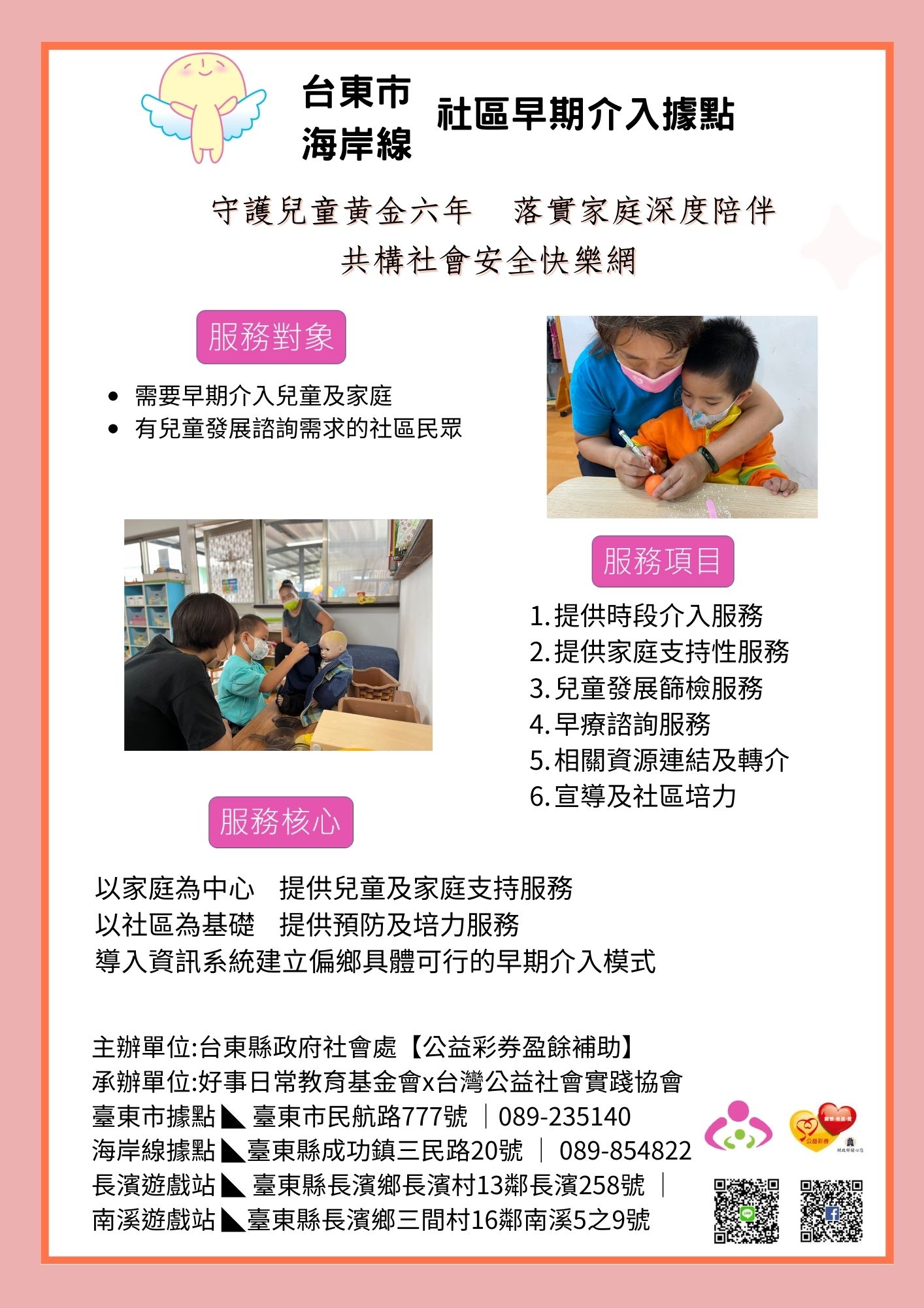 因應台東市區、海岸線區(如成功、長濱、東河)早期介入家庭需求,設置慢飛天使園台東站及台東成功站等服務據點,提供就近且可及性服務,針對0至6歲疑似或確診為發展遲緩的兒童,據點將提供發展篩檢、發展諮詢與介入服務,強化在地的早療支持網絡。
