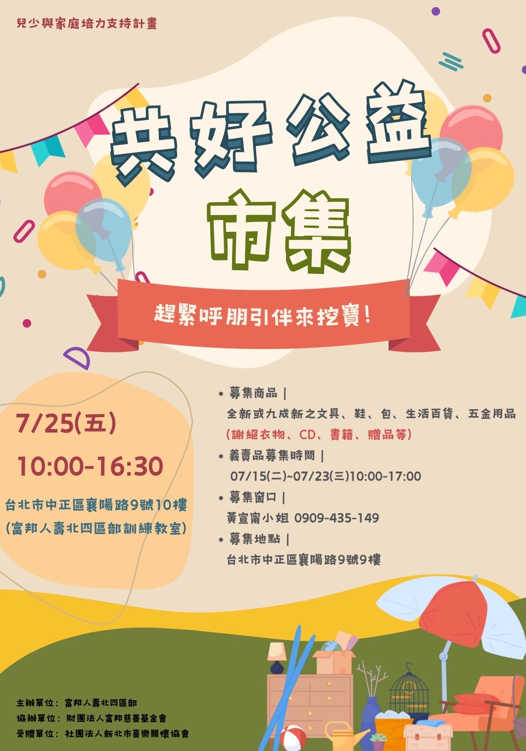 愛心義賣市集的源起~ 喜樂關懷協會主要輔助深坑、石碇地區弱勢學童,當時恰巧公司附近一些店家在兌換股東贈品、同事搬家有一些生活用品要丟棄;便靈機一動,辦個類似跳蚤市場,讓物有所出,環保又有現金收入幫助喜樂關懷協會的學童們;一舉數得!