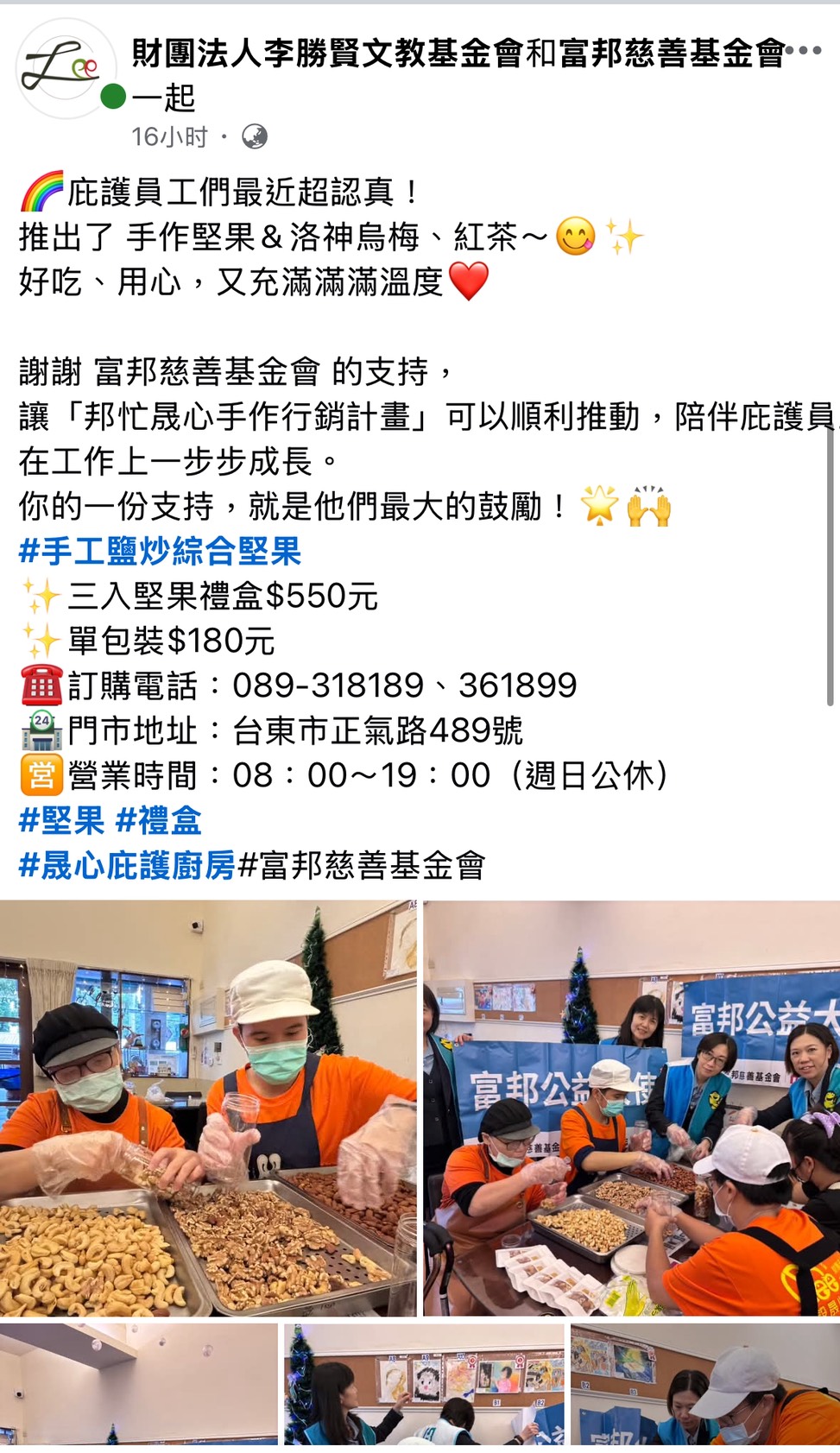 壹、活動內容: 一、請台東富邦證券同仁擔任志工,協助輔導庇護員工進行營養餐盒準備與擺 盤、接單及多元產品推廣時志工工作。 二、志工工作內容 一協助輔導庇護員工做餐飲業務活動的進行。 二協助輔導庇護員工招待禮儀的技能。 三協助輔導庇護員工銷售技能。 三、庇護工場服務是提供以作業訓練為主,作業訓練是需要有專業技能, 本計畫所服務的9人服務使用者,皆會參與此課程訓練及其他相關的訓練 活動: 一餐盒準備:餐盒準備、內用盤餐準備及實務操作、主菜份量及種類。 二行銷技巧:多元產品介紹及推廣、傾聽顧客需求提供建議、接單流程。 三課程安排:每月安排2堂,每堂課程2小時,共6次課程。 四實務訓練安排:每月安排4次,每堂課程2小時,共6次課程。
