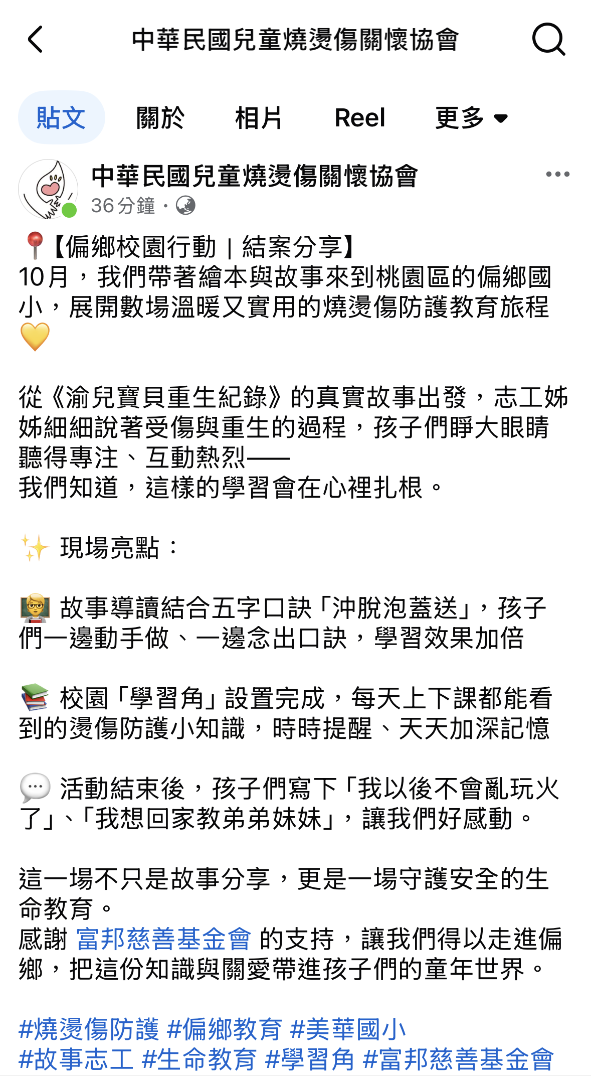 本次於桃園市美華國小辦理二場次燒燙傷預防與急救教育活動,採實地進班與全校共學模式,結合繪本導讀、角色扮演與「沖、脫、泡、蓋、送」五字訣教學,協助師生建立正確的燒燙傷防護與處置觀念。活動包含下列重點內容: 實施次數:共執行 2 場次(10 月份) 受惠對象:全校學生(共 47 人)、教師及教職員(約 10 人) 受惠人次:共計 114 人次(學生與教師總人數 × 2 場) 執行內容: 燒燙傷繪本故事導讀與互動問答 緊急處置五字訣教學及實作體驗 發放燒燙傷防護宣導卡及學習單 建置「燒燙傷知識學習角」:於校內顯眼牆面掛設宣導布條與知識圖卡,協助學童每日複習安全知識 志工支援:由本會培訓志工全程協助活動流程與帶領操作,提升活動品質與陪伴效果 透過本次活動,孩子們展現高度參與動機與學習熱情,不僅能清楚記得正確急救步驟,亦開始懂得觀察生活中的潛在危險源。教師們也表示宣導素材與學習角設計非常實用,願意持續使用於教學與安全提醒中。