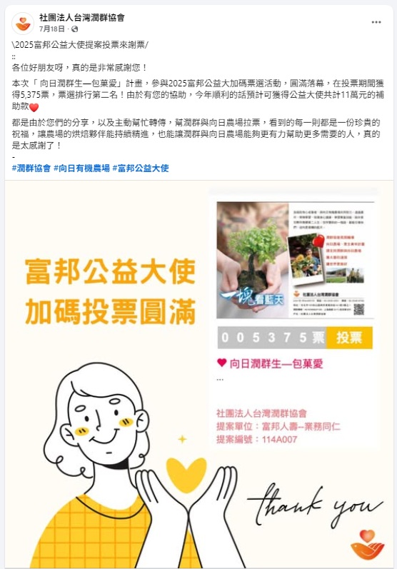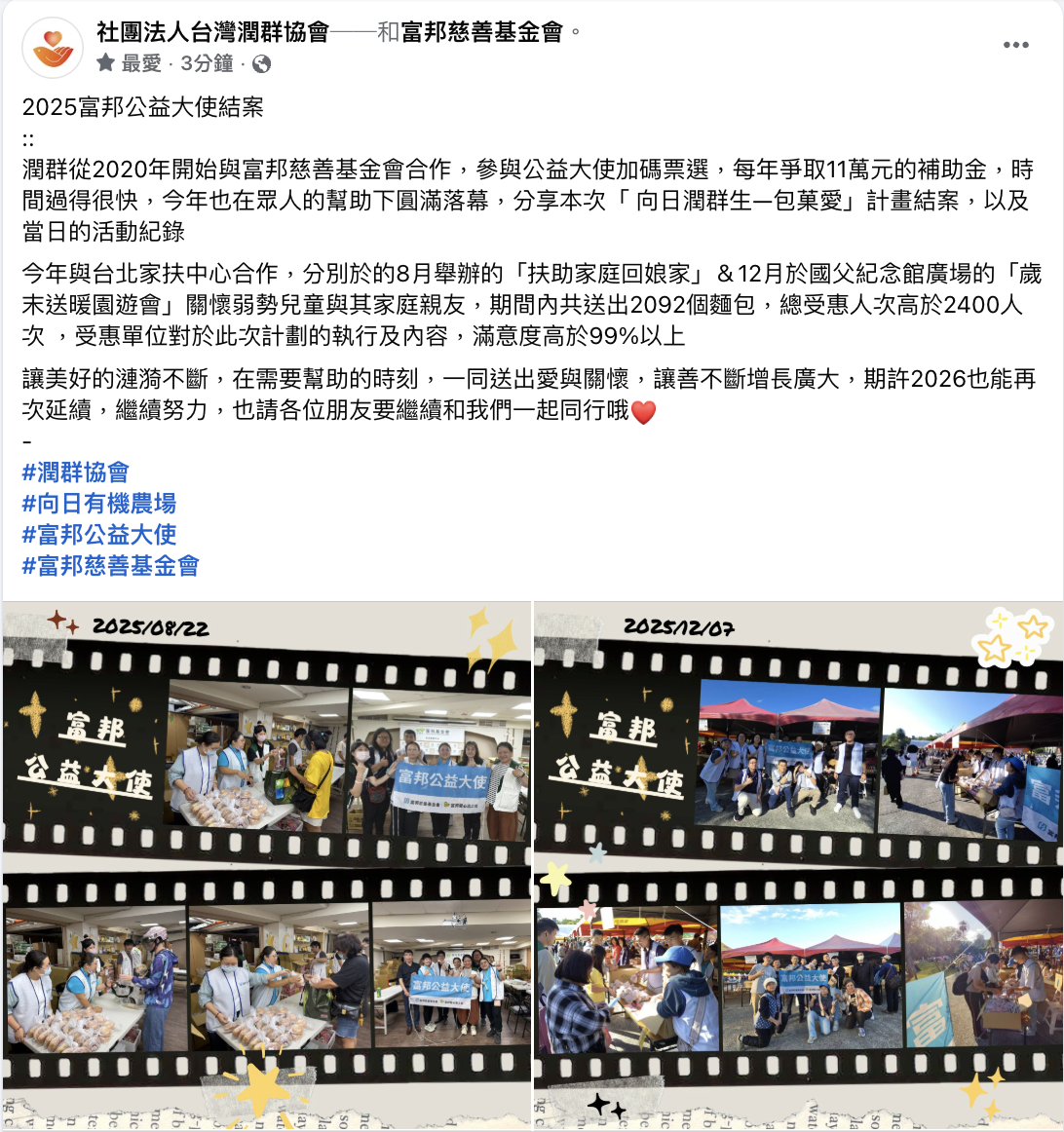 社團法人台灣潤群協會以下簡稱本協會秉持當初成立的宗旨,希望能幫助弱勢族群走入社會,為社會培育人才,在台北內湖山區向日農場,輔導向日有機農場成立更生人自立復歸計畫,農場主人許有勝先生過去即曾因沾染毒癮入獄,在學習佛法後,決心翻轉自己的生命,並投入有機農業,希望能為土地留一口元氣。一路走來,從專注有機農業到關注更多的戒毒更生人,因而開展出不同的面貌,近年更是用烘焙西點麵包,走出一條特別的路,活動名稱取做「包菓愛」就是希望用麵包傳遞愛給弱勢朋友,更期盼透過這個計畫回饋社會,用一顆長遠的發心,陪伴更生人走過生命的幽谷,邁向光明,拓展利他心,並追求、展開新的人生。