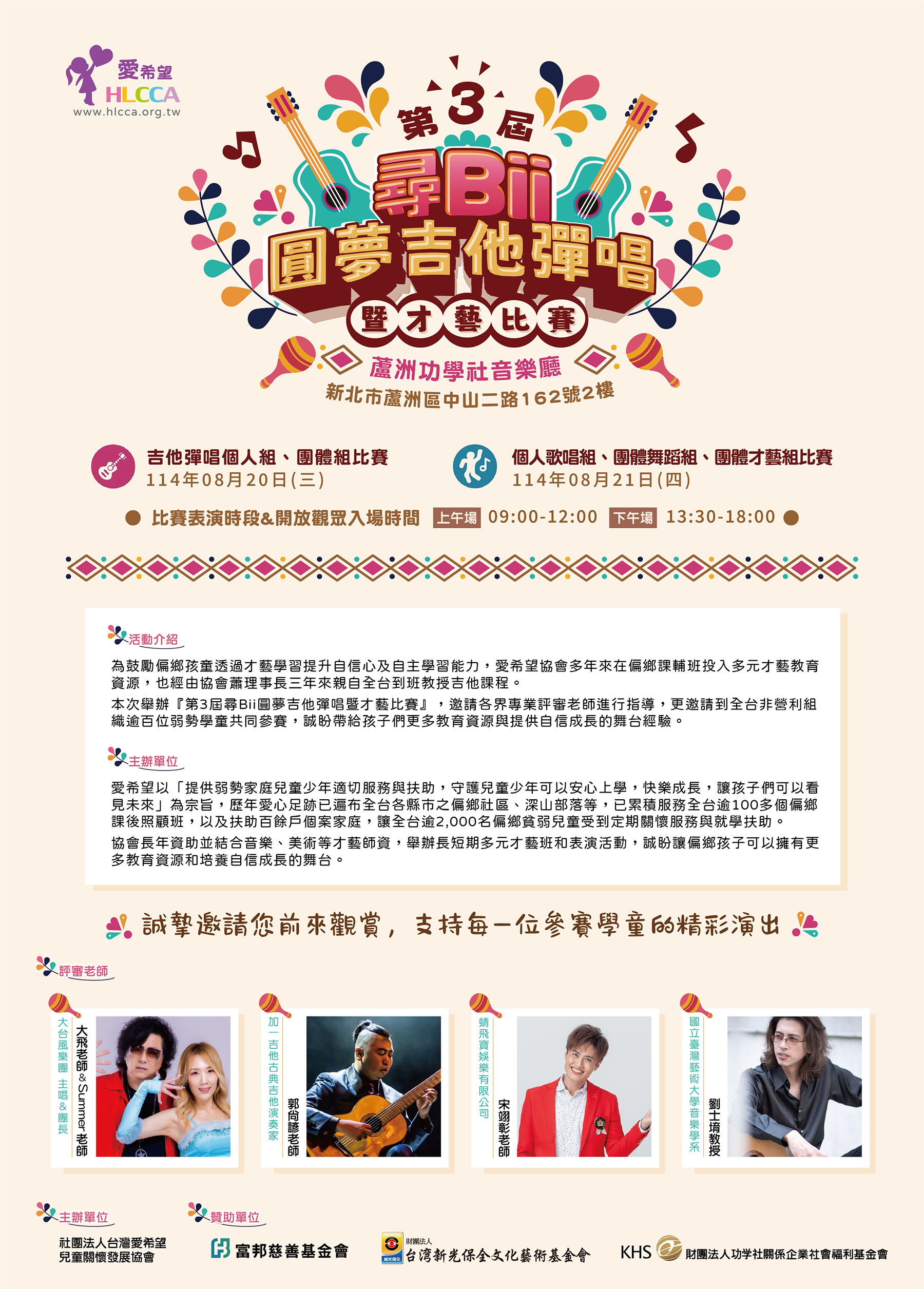 弱勢兒童多元才藝培育發展計畫: 提供偏鄉課輔班學童多元才藝學習,樂器班訓練為2班,受到才藝培育之學童人數共計逾70人。讓偏鄉孩子能發揮潛能,增加自信,培養群體團隊互助精神。 尋bii圓夢吉他培育計畫: 培育全台課輔班學員共計20-30名,採小班制一對一吉他實體教學,讓學童更專注於吉他才藝學習,同時透過期中與期末2次評比競賽,展現自我要求的學習精神,也能在過程中透過專業老師教導體會到學習是需要用對方法及努力練習的負責任態度。 本次『第3屆尋bii圓夢吉他彈唱暨才藝比賽』2日活動中,看見偏鄉貧弱孩子們歷年來的努力,也在比賽中透過評審的講評得到實際的肯定,並獲得鼓勵與獎學金。