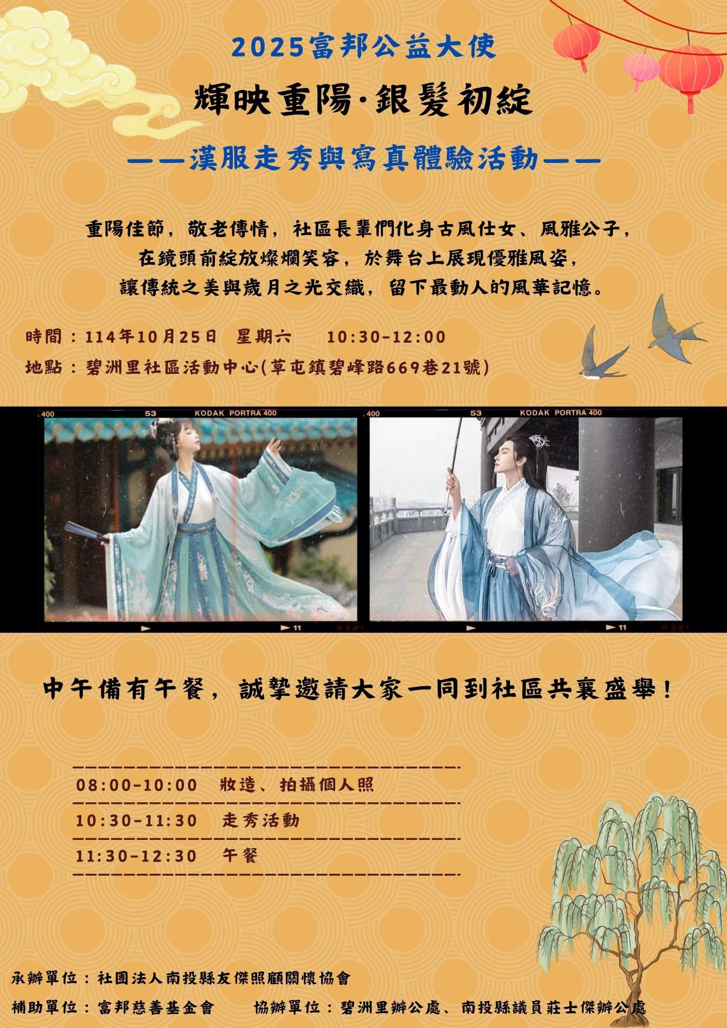 i. 提供長輩一個珍貴的回憶希望為長輩們創造一個特殊且難忘的體驗,讓他們能夠穿上中式漢服,參與走秀和拍攝個人寫真,留下屬於自己的珍貴回憶。不僅能讓長輩感受到社會的關愛,更能讓他們在重陽節這個特別的日子中,感受到自己如同明星般的尊貴與魅力。
