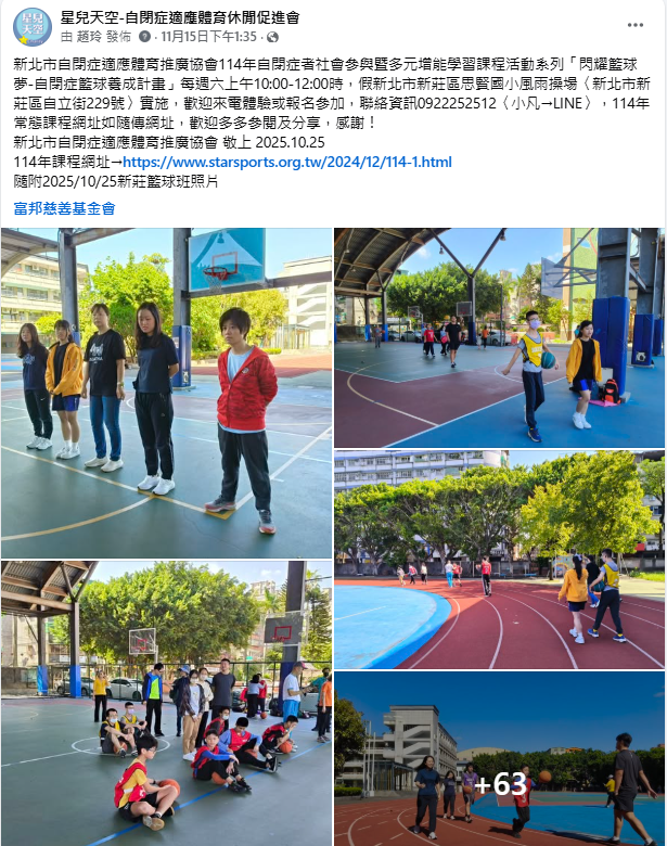 一、計畫背景與目的 本協會致力於支持自閉症者的全人發展, 透過多元化的課程提升其社交互動能力、身體協調性與自我信心. 本次感謝「富邦慈善基金會」的補助, 順利開辦「閃耀籃球夢-自閉症籃球養成計畫」, 希望藉由團體運動的形式, 讓自閉症患者簡稱星兒在結構化且安心的環境中練習體能與社交技巧, 並體驗團隊合作的正向能量. 二、課程資訊 課程名稱:閃耀籃球夢-自閉症籃球養成計畫 上課時間:每週六上午 10:00–12:00 課程期間:10次課程 共20小時 授課地點:新北市新莊區思賢國民小學 新北市新莊區自立街229號 授課師資:專業籃球教練與特教背景助教共同指導 三、課程內容與教學方式 課程內容以基礎體能、籃球技巧與團隊合作為三大核心, 並配合學員需求進行逐步引導: 1. 暖身與基礎體能訓練 透過伸展、步伐訓練與簡易跑步增進協調性與耐力. 2. 籃球基本技巧練習 包含運球、傳球、投籃、腳步移動等, 由簡入深地帶領學員建立正確動作模式. 3. 小組合作活動 藉由兩人一組的遊戲、接力傳球等活動練習社交互動、輪流等待與合作技巧. 4.實戰體驗與小型比賽 在第10次課程舉辦簡易比賽, 讓星兒將所學應用於真實情境中, 提升成就感. 教學團隊和志工全程採用視覺提示、口語簡化、示範動作與個別協助的方式, 確保每位星兒都能在安全且有支持的環境中參與. 四、星兒參與情況與學習成果 本期課程共24名自閉症學員參與,大多能全程投入活動,顯示高度興趣與學習動機. 主要成果如下: 1. 動作協調性與體能顯著提升 多數星兒在運球穩定度、投籃動作與方向感上有明顯進步. 2. 團隊合作能力增強 在傳球與比賽時, 逐漸能與同伴互動, 表現出主動協助或回應他人的行為. 3. 社交互動改善 星兒開始願意與同儕打招呼、輪流等待或分享球具比課程初期更加成熟. 4. 自信心提升 多位家長回饋, 他們的孩子在課程後變得更勇於嘗試運動與參與團體活動. 五、家長回饋與觀察 家長普遍反映孩子每週都期待上籃球課, 並提到籃球班讓孩子在課堂外也願意持續練習. 部分家長表示孩子的情緒調節與作息也因規律運動而變得更穩定. 六、計畫成效與後續建議 閃耀籃球夢-自閉症籃球養成計畫成功達成預期目標, 為學員提供安全、有趣且具成長性的運動環境.建議未來持續規劃進階班別, 讓不同能力的孩子都能獲得適切挑戰; 同時增加親子合作,促進家庭支持與運動習慣養成. 七、致謝 感謝富邦慈善基金會的補助支持, 使本協會得以推動本次籃球課程, 讓星兒透過運動展現潛能並獲得寶貴成長. 我們將持續努力, 提供更多優質服務與課程, 陪伴每一位星兒穩健前行.