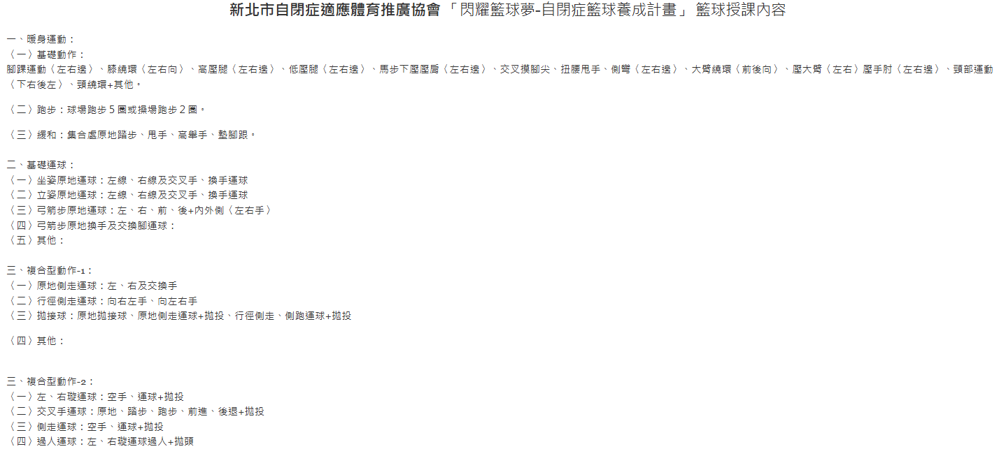 為提升自閉症者的社交能力、運動能力與自信心, 本方案設計為期10週,每週進行1次、每次2小時的籃球訓練課程, 針對自閉症者進行個別化調整與支持.
