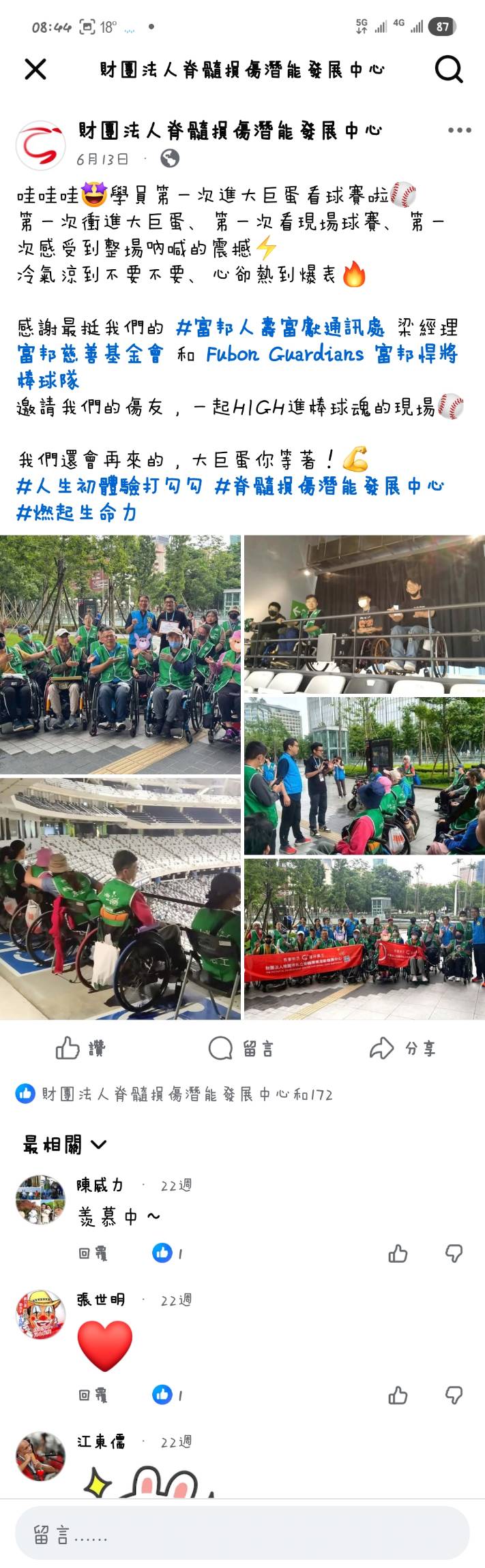 其一:提升脊髓損傷者的社會適應能力及自信心。我們特別安排每期讓傷友與同仁一同前往富邦球場(或其他球場)觀賞球賽。這些活動旨在培養傷友的獨立生活技能,增進其溝通能力及團隊合作精神,並鼓勵他們勇敢面對他人,提升人際關係與自信心。