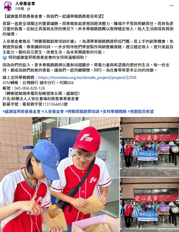 針對清寒單親媽媽推出「烤雞蛋糕創業培訓計畫」 提供低階門檻、易上手的創業機會:結合培訓、 設備補助與市場導入,協助她們學習製作與銷售,進而建立穩定收入,提升家庭經濟及自主能力,最終達到改善生活、 自力更生、 終結貧窮的目標, 為社會帶來正向影響,後續經由培訓後,由志工陪同媽媽們一起參與愛心義賣協助販售。