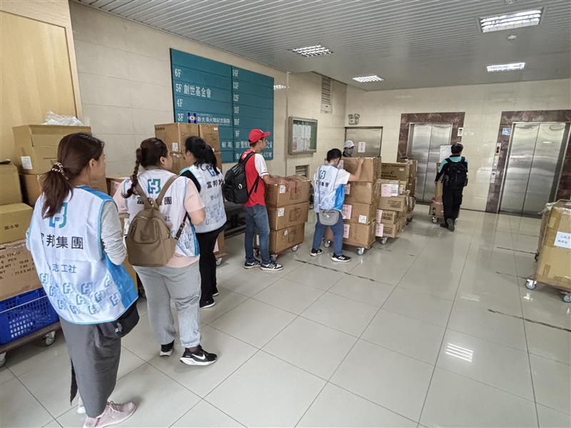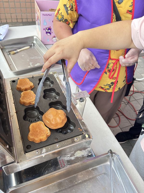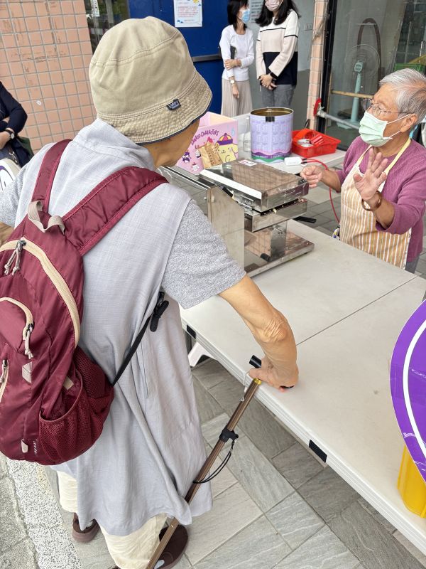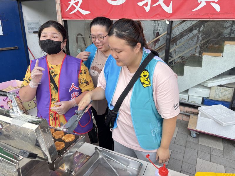 本次雞蛋糕義賣活動由6位富邦志工及4位供應商志工飛虹及大世科協助單親媽媽擺攤、場佈、製作雞蛋糕及販賣。