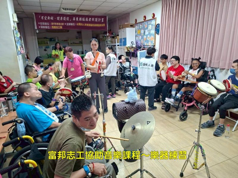 有系統地透過音樂元素的安排,在專業音樂老師引導的互動環境裡,產生快樂的情緒使個案獲得心理健康的目的。提供20位腦麻身障者,共計8堂課,每週安排2小時打擊音樂課程。預計160人次受惠。