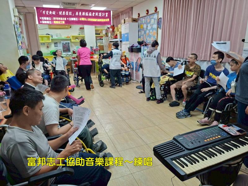2.運用音樂治療課程,使腦性麻痺者透過音樂老師專業訓練,提升腦麻者肢體運動機能,增加自主反應能力。本活動共計8堂課程,每堂2小時,預計20人參加,共160人次腦性麻痺者受惠。