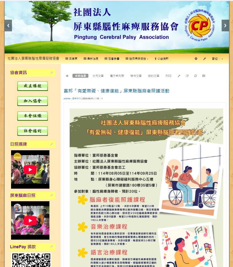 1.運用腦麻者復能照護課程,提升失能腦性麻痺者生活處遇能力,本活動共計8堂課程,每堂2小時,預計20人參加,共160人次腦性麻痺者受惠。