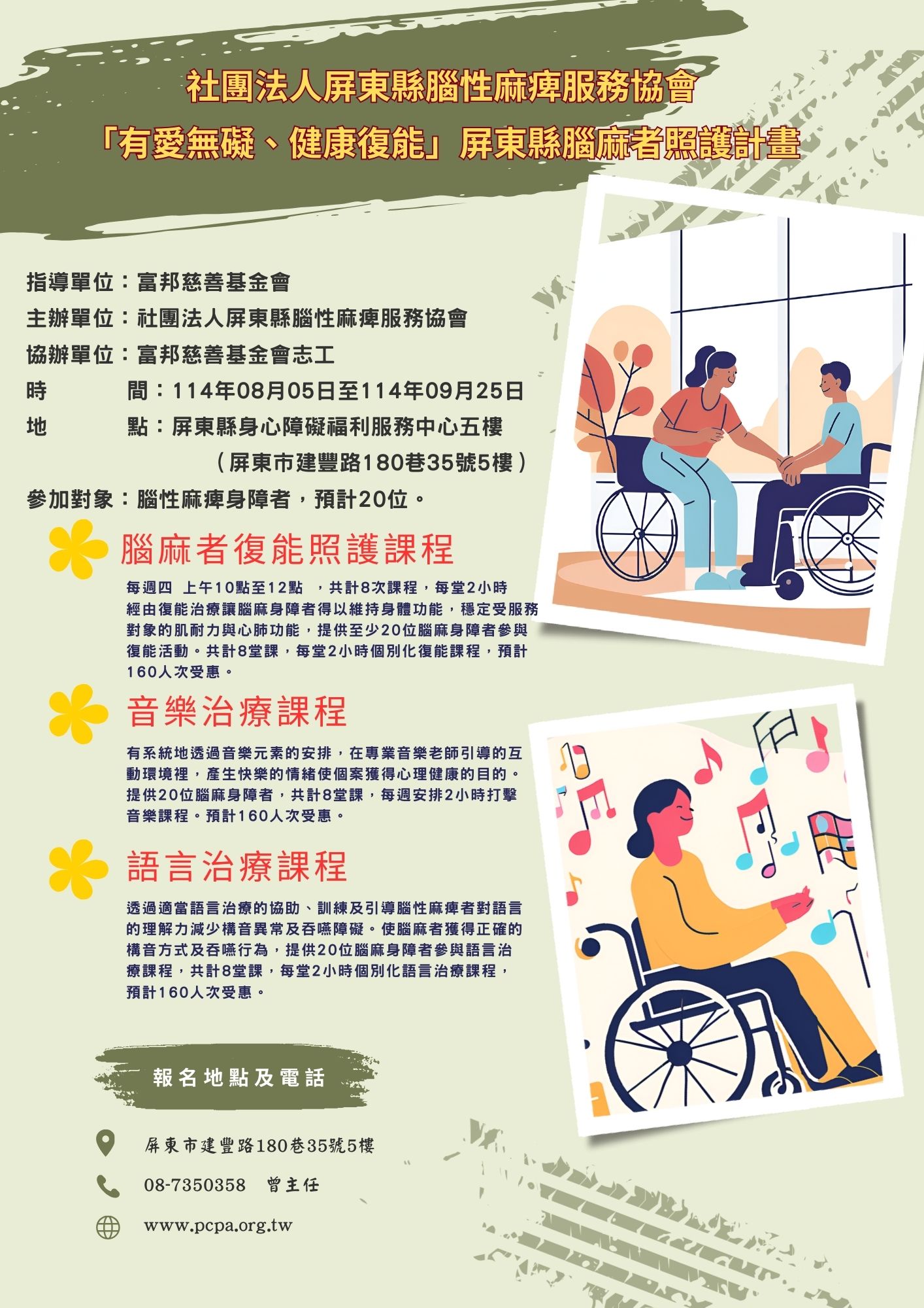 114年考量腦麻者之迫切需求,114年將再增加語言治療課程,活動內容如下: 1.提供復能課程,幫助腦麻者復能照護,維持身體功能。 2.透過音樂治療,協助腦麻者心理健康,展現自信心。 3.增加語言訓練課程,克服腦麻者語言與吞嚥之障礙。 4.辦理感恩音樂會,增加家庭社會參與。