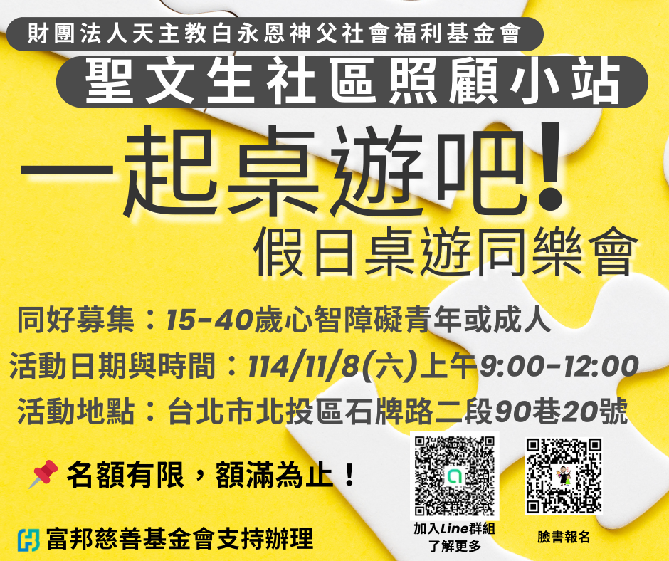 天主教白永恩神父社會福利基金會長年以社區為基礎,陪伴發展遲緩兒童(慢飛天使)、身心障礙者及其家庭,打造從早期療育到成人階段的全方位支持系統。本計畫以「共生‧共融‧共好」為核心,串聯北投、士林地區親子館、幼兒園、早療資源中心及社區組織,讓更多家庭在熟悉的社區中獲得可近性的照顧或支持。 年度活動涵蓋兒童發展篩檢、融合團體、親職講座、小學轉銜準備、親子音樂團體等,以增進兒童的認知、社交、情緒與生活自理能力,並提供家長專業教養諮詢與陪伴。同時也針對成人身心障礙者設計簡易料理、桌遊、手作diy等活動,支持生活技能的維持、社交參與與自信,並為照顧者創造喘息機會。 透過跨單位合作與社區網絡建立,基金會期待形塑一個友善、支持且具永續性的在地共融環境,讓每一位特殊需求者都能「一起生活,好好生活」。