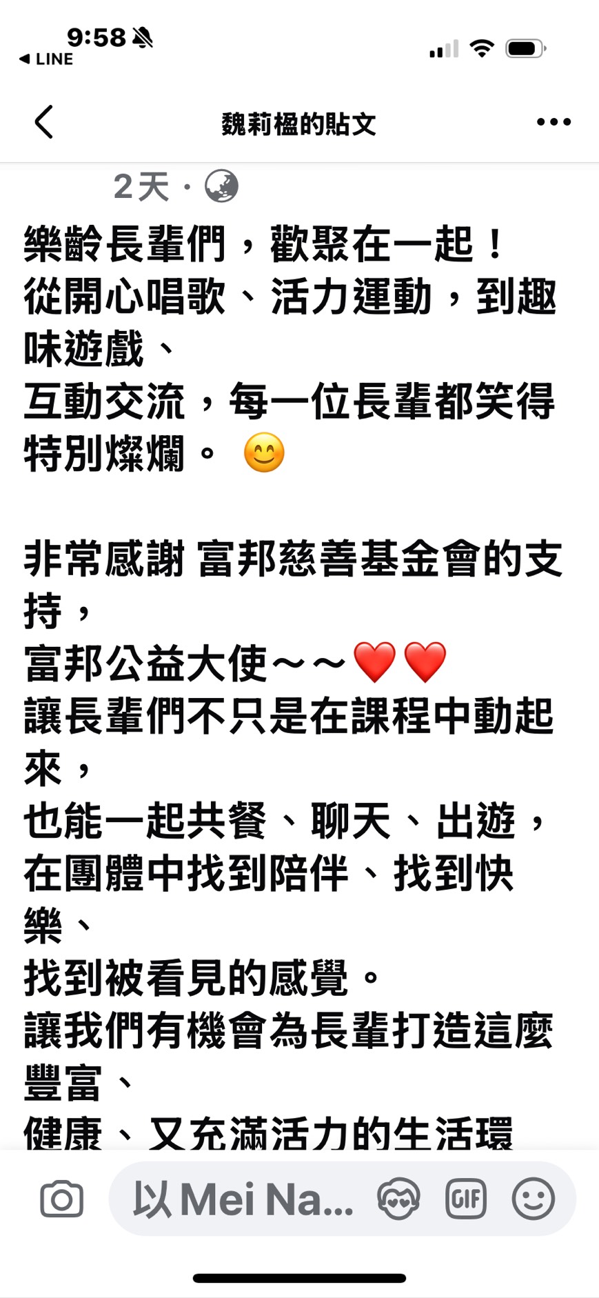 活動辦理目的,希望藉此富邦大使計畫補助機會,辦理符合衰弱、中低收長者的健康促進活動,能夠讓長者的生活增加體驗一些專業課程,促進他們身心的健康,增添他們生活上的運動量,增進腦力與肌力,與增加人際互動,藉機使他們能多走出家門參與社會互動,使他們也能享有健康晚年、享有預防延緩失智失能的服務,使長者感受到社會的關懷、愛與溫暖。