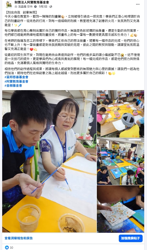 五、每月於本會粉絲頁發布至少一則刮畫課程活動內容,並於文中揭示企業公益經費挹注,連結其他相關粉絲頁或網站,增加「刮出自我 創意無限」身心障礙者支持服務方案曝光機會,提升身心障礙者自信心,並宣傳課程執行成果及企業公益形象。