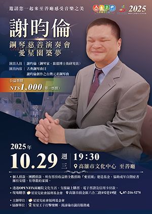 音樂築夢,用行動守護星星兒。 星星兒社會福利基金會自 2000 年成立以來,致力於成年自閉症者的長期照顧與生涯發展。隨著家長年邁,許多家庭最深的擔憂是:「當我們不在了,孩子能去哪裡?」 為了回應這份需求,基金會推動 「愛星園」建造計畫,期望打造一個安全、專業且人性化的全日型住宿家園,成為成年自閉症者的「第二個家」。 本次音樂會特別邀請 旅德鋼琴家謝昀倫 獨奏獻演。他自幼因視網膜剝離而全盲,卻以堅毅和才華走上國際舞台,將音樂視為生命的語言。他的琴聲飽含情感與力量,不僅傳遞藝術之美,更傳遞 勇敢、希望與愛。 這場音樂會不只是藝術饗宴,更是一場社會行動。所有票房收益(扣除必要成本後)將全數捐助「愛星園」建造基金,協助成年自閉症者擁有安穩、有尊嚴的家園。 邀請您購票參與,不只是欣賞一場動人的音樂會,更是親手為自閉症者築夢。 因為有您,他們的未來將更安穩、更有尊嚴。