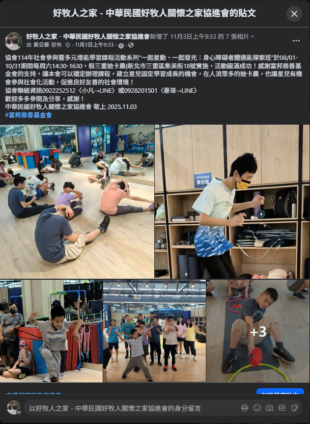 本次身心障礙者體適能班設計以「安全參與、功能提升、身心整合」為核心目標,透過120分鐘的全方位課程,協助身心障礙者提升身體機能、促進心理健康及增進社交互動。每班人數上限為12人,採小班制教學,確保學員能獲得充分指導與關注。 一、課前準備與個別關懷(10分鐘) 學員報到後由人員協助確認健康狀況,導師與助教進行簡短交流,了解學員當日身心狀態,並確認特殊注意事項(如藥物服用、身體不適等)。 二、暖身與動態伸展(20分鐘) 進行全身關節活動操及低強度有氧熱身(如踏步、拍手操、簡單律動),目的在提升心肺活性與肌肉彈性,預防運動傷害。 三、主訓練區段(60分鐘) 依學員能力與障礙類型進行分組,輪流進行下列四種訓練模組,每項模組約20分鐘: 有氧訓練區:使用坐姿腳踏機、踏板上下踏、原地行走,提升心肺耐力。 平衡協調區:設計如障礙步道行走、平衡墊、視覺追蹤球等練習。 團體互動區:包含輕鬆競技或合作性活動,如傳球遊戲、輪圈挑戰,增進學員間的互動與合作。 四、靜態伸展與身心放鬆(15分鐘) 結束主訓練後,進行全身拉筋與深呼吸引導,可搭配輕音樂或引導語音進行,幫助學員從緊繃的狀態恢復,放鬆心情。 五、課後回饋與紀錄(15分鐘) 課程最後進行圓圈時間,邀請學員表達感受與回饋,導師給予鼓勵與個別建議,並紀錄當日學員參與狀況與表現,作為後續課程調整依據。
