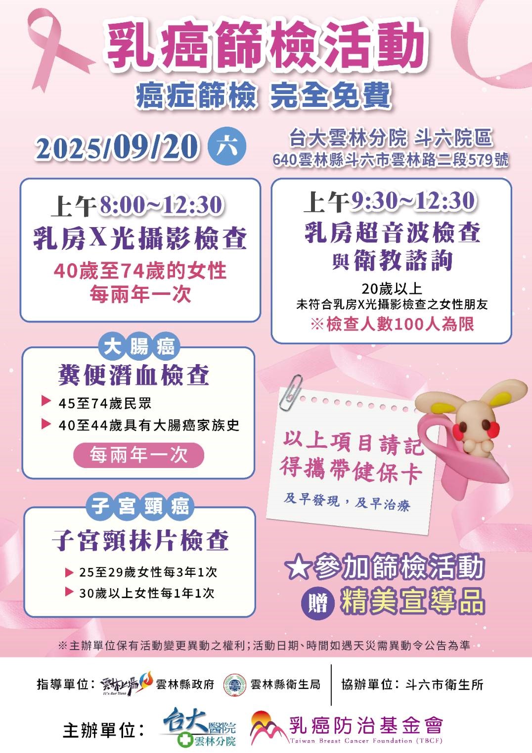 本次活動以乳癌防治篩檢為目的,雲林縣偏鄉屬篩檢率偏低之地區,搭配台大雲林斗六分院配合並於斗六院區內舉辦篩檢活動,於活動前期廣宣本次活動, 讓大斗六地區斗南,莿桐、古坑、林內附近鄉鎮婦女朋友,參加本次乳癌防治免費篩檢活動,提醒婦女朋友癌篩重要,提早發現提高治癒率。