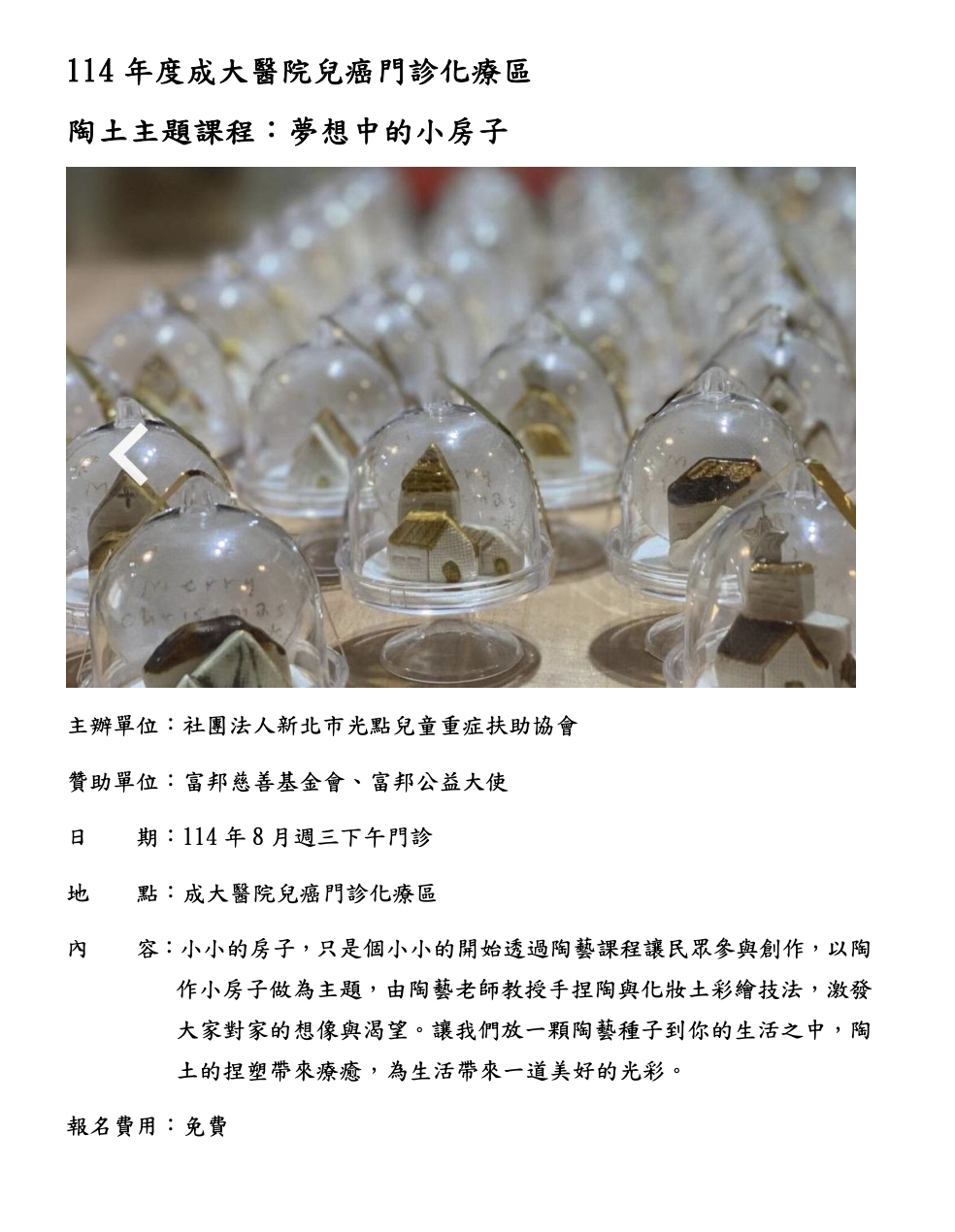 在醫院門診化療等待的漫長時光中,我們希望為病友與家屬帶來一種不一樣的陪伴與支持。結合陶土工作坊專業師資團隊,我們精心準備了200份陶土材料與相關教具,規劃於門診等待區舉辦陶土創作課程。透過這樣的捏塑歷程,提供參與者一個溫柔而安全的情緒出口,讓身心在創作中獲得釋放與滋養。