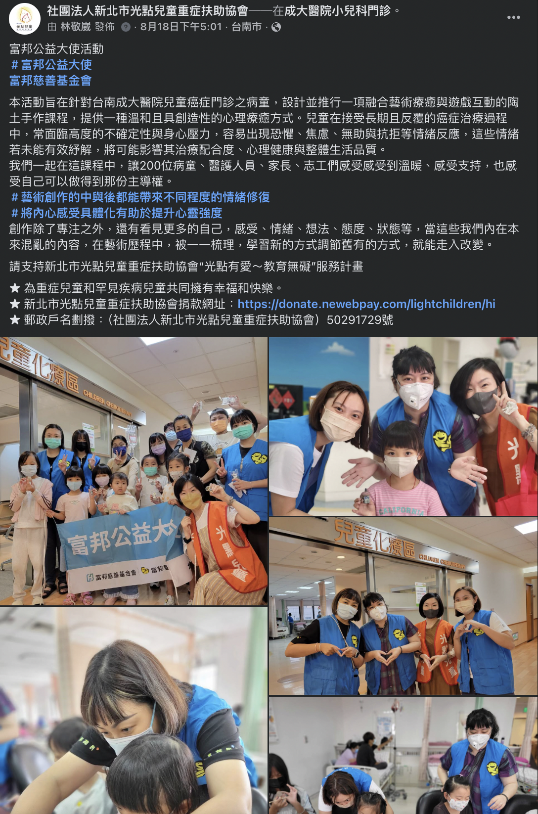 藝術創作具有強大的情緒抒發功能,能讓病童在無壓力的環境中表達內在感受,不論是恐懼、悲傷或希望,皆可透過色彩與手作過程呈現與釋放,進而達到情緒調節與心理療癒的效果。