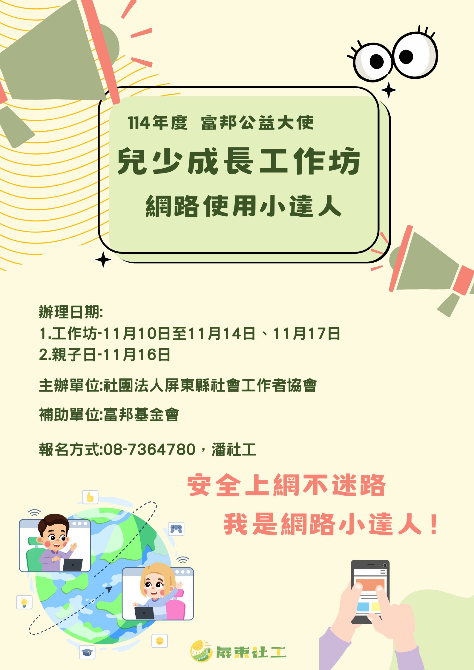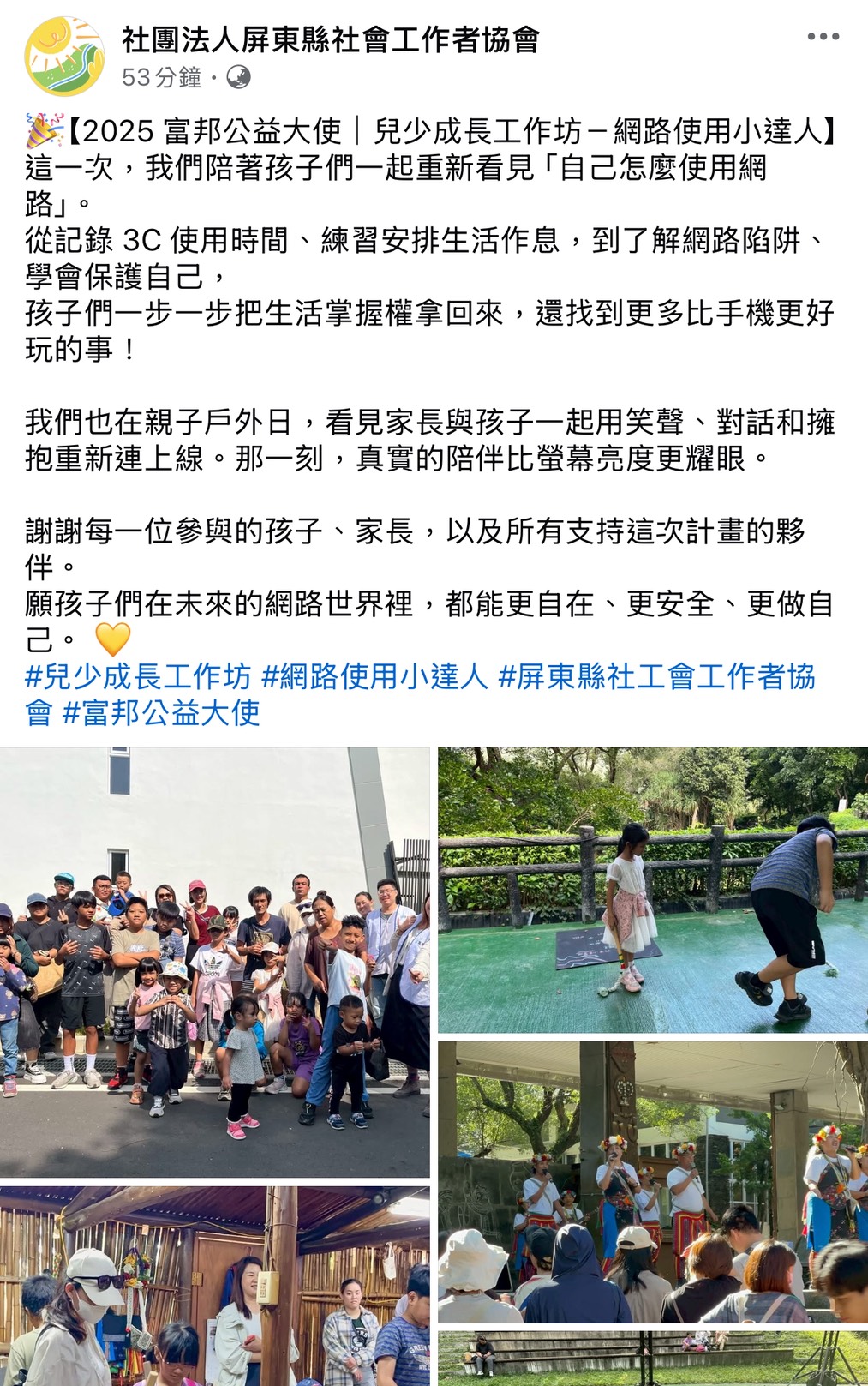 本次辦理「兒少成長工作坊-網路使用小達人」共六堂課,帶領兒少透過自我覺察、討論與體驗活動,認識 3c 產品與網路使用對生活與身心的影響。課程內容包含:記錄並檢視個人網路使用時間、製作每日作息圖表、學習網路風險與陷阱辨識、觀賞案例影片與分組討論,以及練習自我保護行動策略。 透過循序設計,兒少逐步提升數位素養、媒體識讀能力與自我管理意識,並在最後完成「網路使用小達人」挑戰與成果分享。此外,亦辦理一場親子戶外互動日,帶領家庭透過無3c干擾的合作闖關、分享與「家庭3c使用公約」製作,促進親子溝通與共同生活節奏的建立。