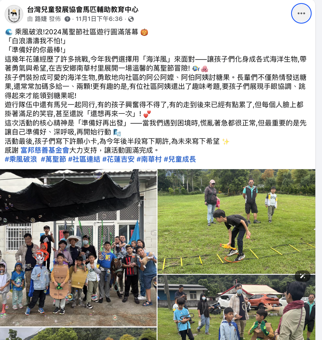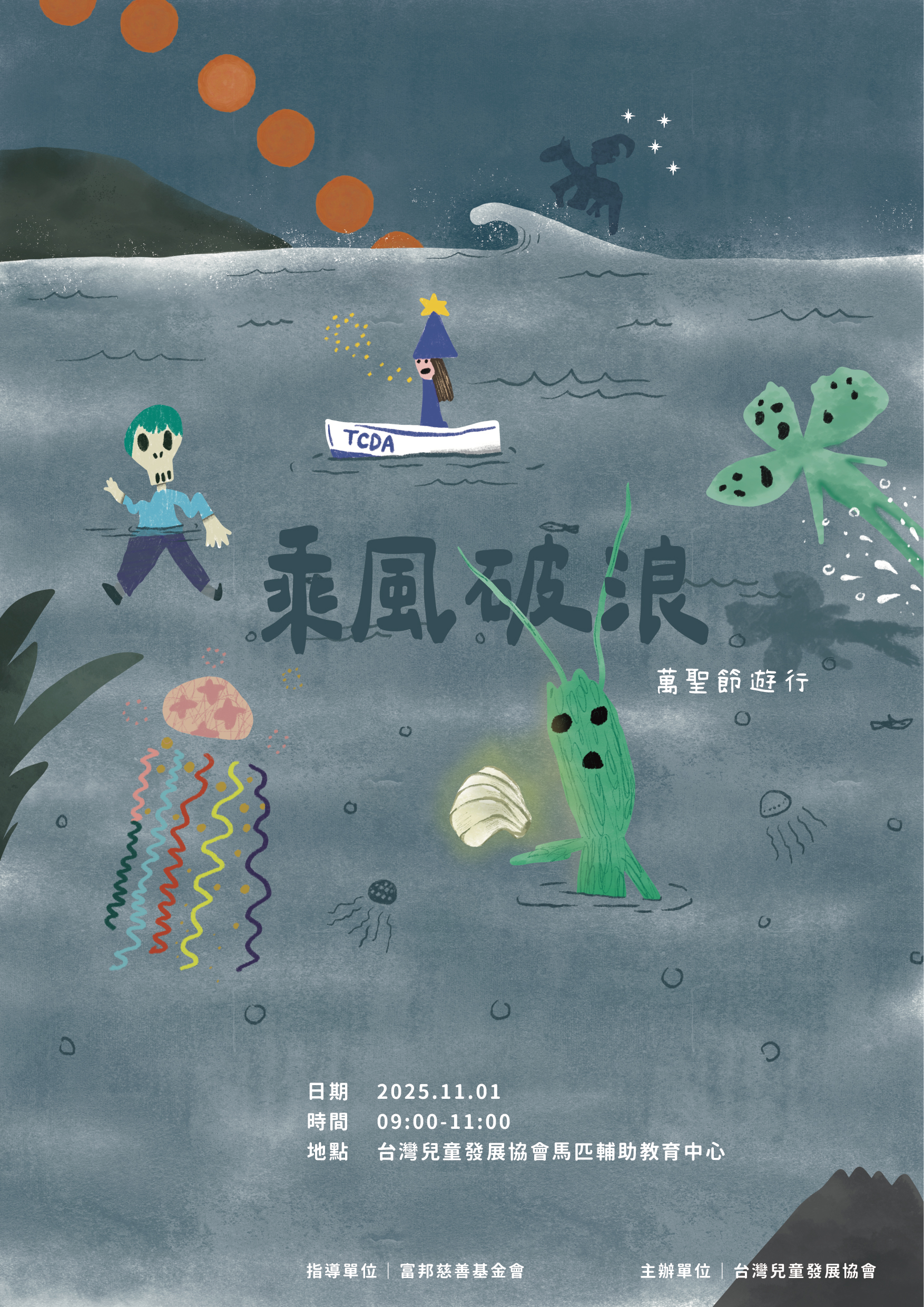 台灣兒童發展協會舉辦年度萬聖節社區遊行活動,今年以「乘風破浪」為主題,讓孩童化身各式海洋生物,與社區居民進行溫馨互動,展現在地凝聚力。